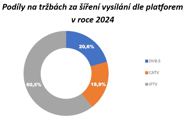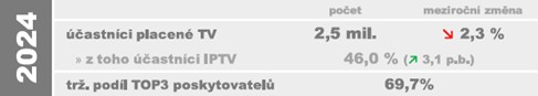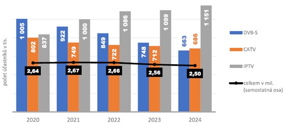 Celkový počet účastníků služeb placeného televizního vysílání v posledních třech letech klesal, když úbytek uživatelů kabelové a zejména satelitní platformy nestačil pokrýt ani výrazný vzestup kategorie IPTV. Vysílání prostřednictvím IP protokolu v rámci vysokorychlostních sítí se poté, co v roce 2021 překročilo úroveň 1 mil. účastníků, stalo nejvyužívanějším způsobem příjmu a v roce 2024 se již podíl této platformy začal přibližovat polovině všech uživatelů služeb placené televize.