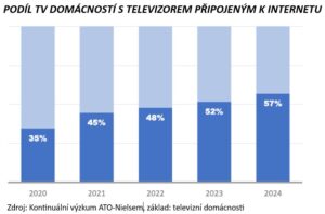 Podle dat ČSÚ bylo v roce 2024 více než 89 % domácností vybaveno připojením k internetu a přes 48 % jich využívalo tzv. chytrý televizor. Kontinuální výzkum ATO – Nielsen uvádí, že alespoň jeden televizor připojený k internetu deklarovalo v témže roce 57 % televizních domácností. S nárůstem těchto ukazatelů logicky stoupá i míra konzumace audiovizuálního obsahu prostřednictvím sítě internet, s možností využití různých druhů a počtů koncových zařízení, kdy poskytovatel dané služby nemusí být nutně zároveň poskytovatelem služby přístupu k internetu (tzv. OTT způsobem). Dle již výše zmíněných dat ČSÚ sledovalo v roce 2024 televizní vysílání na internetu 32,4 % respondentů, 42,1 % si jich pak platilo alespoň jednu streamovací SVOD službu. Současným trendem je pak propojování těchto služeb do nových produktů nabízených jedním poskytovatelem, lze tak v rámci předplatného jedné služby sledovat např. lineárně vysílané zpravodajství, zpětně shlédnout sportovní přenos či zvolit z katalogu oblíbený film (např. služba Oneplay, spuštěná během prvního čtvrtletí 2025, která kombinuje televizní platformu O2 TV a streamingovou službu Voyo).